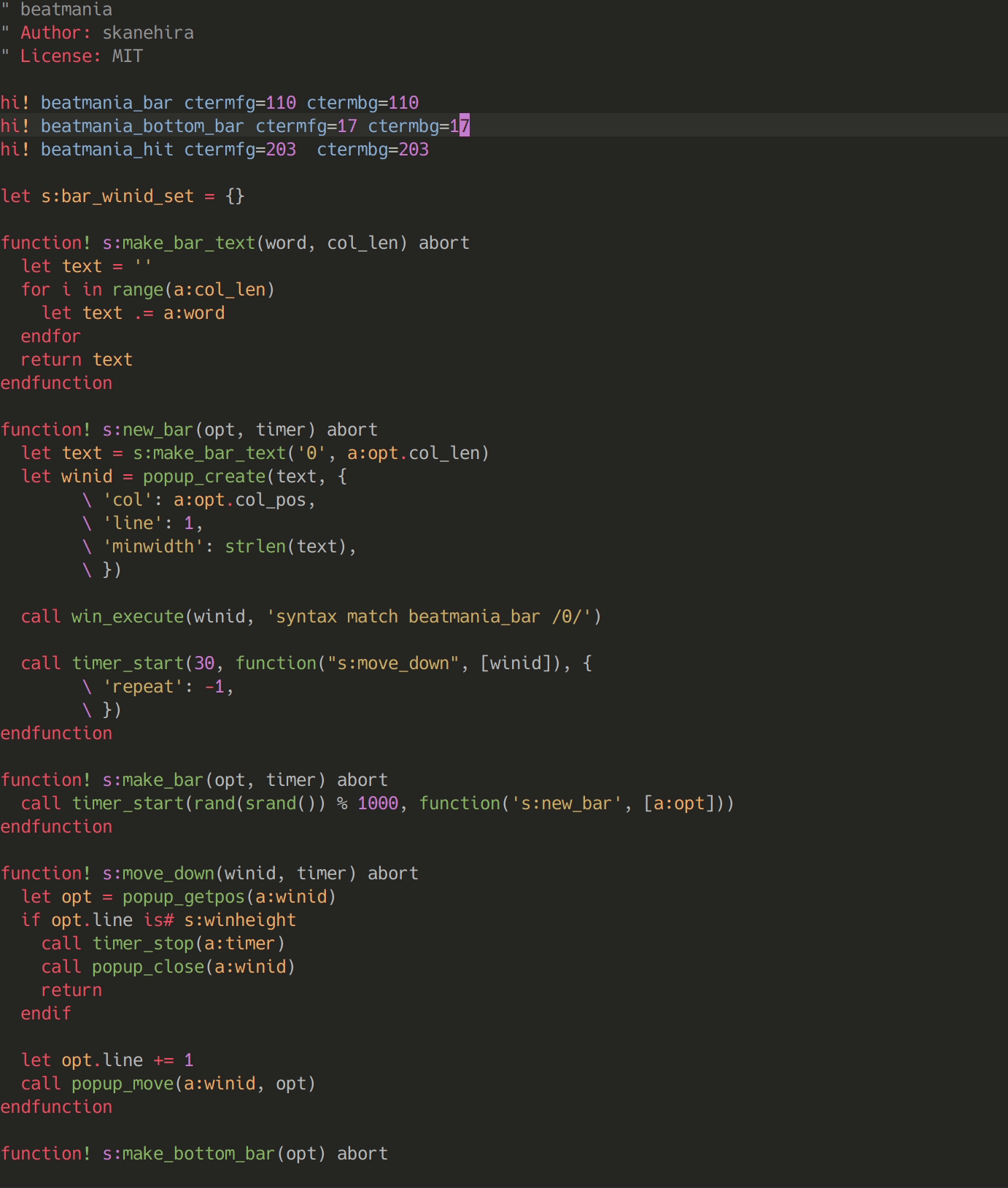 function! s:create_window(config) let buf = nvim_create_buf(v:false, v:true) let win_id = nvim_open_win(buf, v:true, a:config) return win_id endfunction function! s:move_floating_window(win_id, relative, row, col) let newConfig = {'relative': a:relative, 'row': a:row, 'col': a:col,} call nvim_win_set_config(a:win_id, newConfig) redraw endfunction function! s:focus_to_main_window() execute "0windo :" endfunction function! s:get_col() " when `set nonumber` not need adjustment if &number == 0 return 0 endif " not support over 1000 line file return 4 endfunction function! s:split_words() let words = split(getline('.'), '\zs') let result = [] let index = 0 let i = 0 let word = '' let split_num = 7 while i < len(words) let word = word . words[i] if i % (len(words)/split_num) == 0 && i != 0 call insert(result, word, index) let word = '' let index += 1 endif let i += 1 endwhile call insert(result, word, index) return result endfunction function! s:fall_window(win_id) let move_y = line('w$') - line('.') let config = nvim_win_get_config(a:win_id) for y in range(0, move_y) call s:move_floating_window(a:win_id, config.relative, config.row + y + 1, config.col) sleep 4ms endfor endfunction function! s:set_color_random(win_id) let color = '#' . printf("%x", Random(16)) . printf("%05x", Random(69905)) let hl_name = 'ClipBG' . a:win_id execute 'hi' hl_name 'guifg=#ffffff' 'guibg=' . color call nvim_win_set_option(a:win_id, 'winhighlight', 'Normal:'.hl_name) endfunction function! s:create_words_window() let row = line('.') - line('w0') let col = s:get_col() let win_ids = [] let words = s:split_words() for word in words let width = strdisplaywidth(word) if width == 0 continue endif let config = { \'relative': 'editor', \ 'row': row, \ 'col': col, \ 'width': width, \ 'height': 1, \ 'anchor': 'NW', \ 'style': 'minimal', \} let win_id = s:create_window(config) call add(win_ids, win_id) call s:set_color_random(win_id) " call nvim_win_set_option(win_id, 'winblend', 100) call setline('.', word) call s:focus_to_main_window() let col += width endfor return win_ids endfunction function Random(max) abort return str2nr(matchstr(reltimestr(reltime()), '\v\.@<=\d+')[1:]) % a:max endfunction function! s:main() abort let win_ids = s:create_words_window() " fall current line call setline('.', '') for win_id in win_ids call s:fall_window(win_id) endfor execute 'normal dd' " close each floating window for win_id in win_ids call nvim_win_close(win_id, v:true) endfor endfunction call s:focus_to_main_window() nnoremap <silent> T :call <SID>main()<CR>